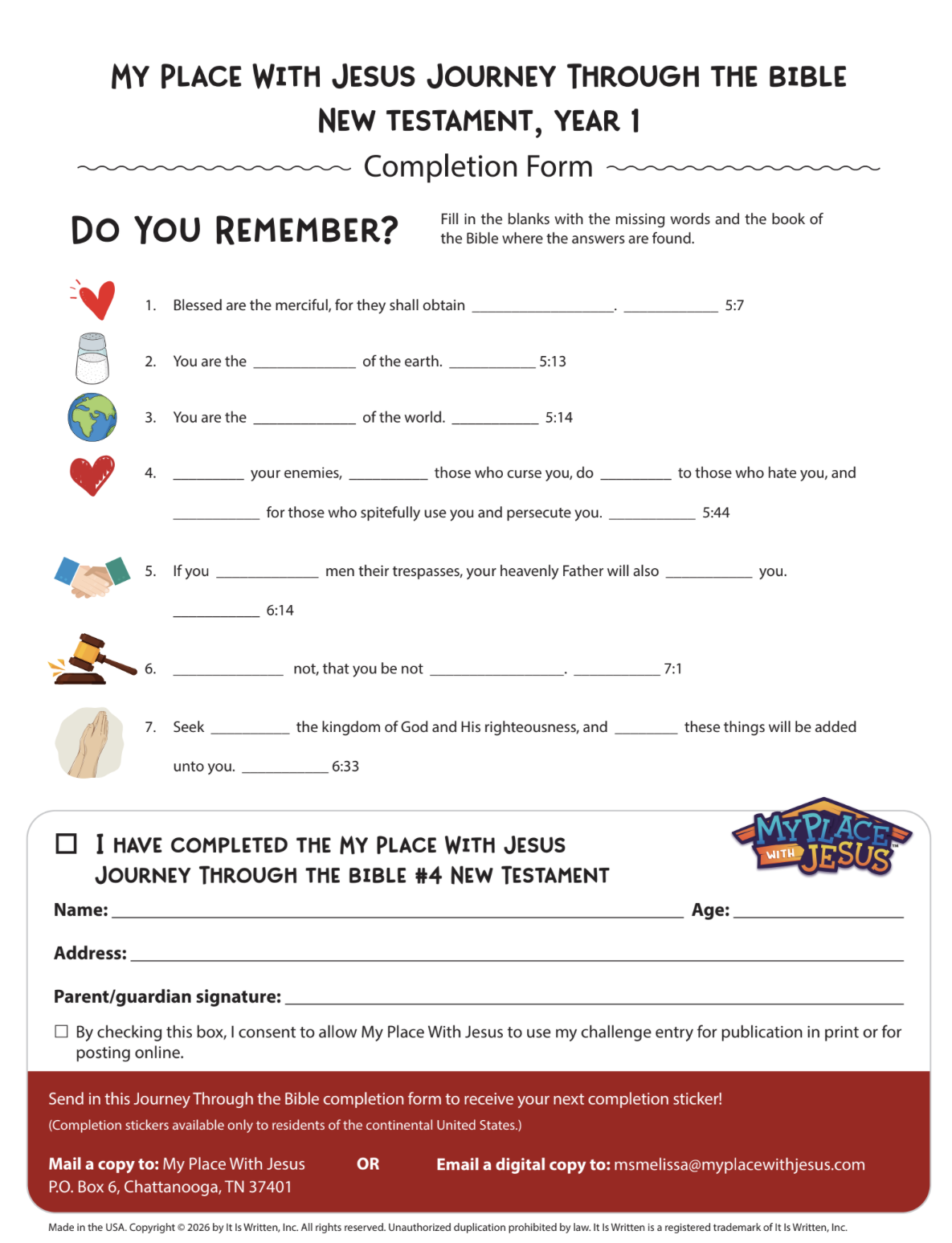 No matter when your Journey begins or ends, you will receive a special prize at the end of your Journey (1-12 of either Old or New Testament).
